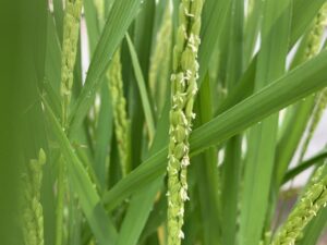 師匠に聞いてみると、朝の早い時間だけ、緑のもみが開いて、伸びてきたおしべの花粉と中にあるめしべが受粉してお米になるということ。しかも、その後その籾は閉じてしまうのだそうです。今日も見てみましたが、緑の籾が開いているところを見ることはできませんでした。